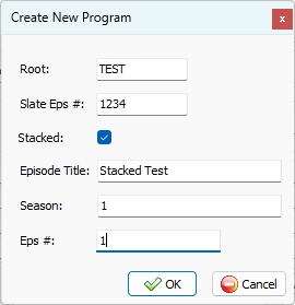 | 5. | Enter the new episode Root Enter the New Episode Slate # Check Stacked. Enter the new Episode Title Enter the Season and Episode Number Click Ok. |