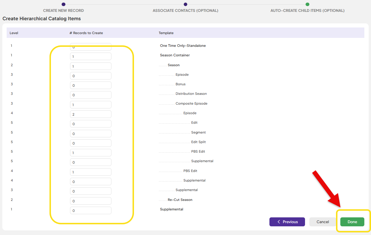 | 5. Fill out number of Season Container, Season, Composite Episode, Episodes, PBS Edit under each Episode, PBS Edit for the Composite Episode. Click Done. | ![]() |