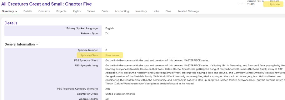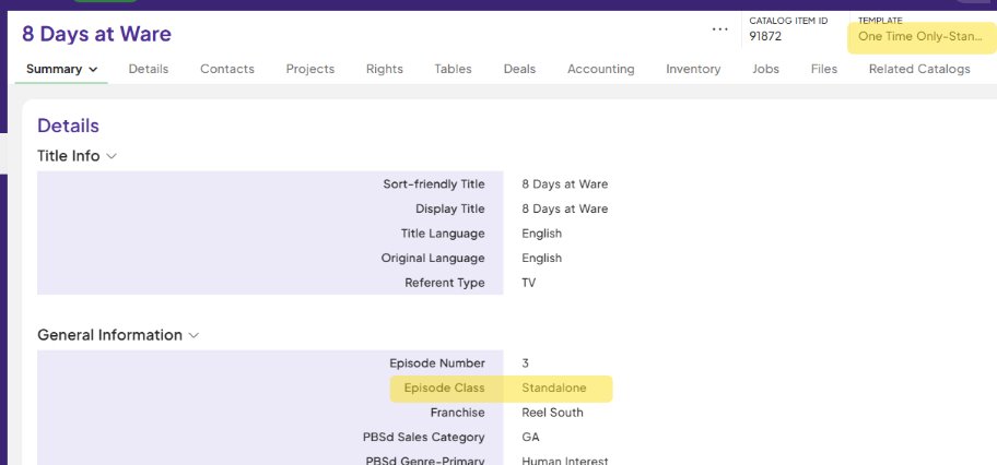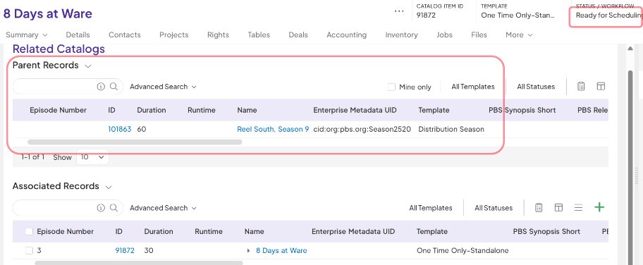 - Standalone Episode Parent= Distribution Season (**Note: In this case, Distribution Season requires Standalone Series as parent record)