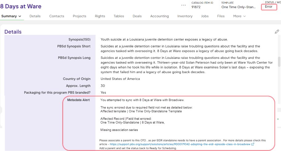 **Note: When there is no parent record associated to Standalone OTO or Standalone Episode and status is updated to Ready for Scheduling, Metadata Alert is generated and Status is set to Error. Associate correct parent record and update the status to RFS again.